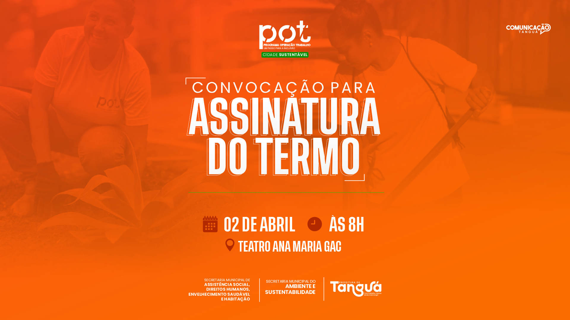 Meio Ambiente - 01/04/26 A Prefeitura convoca os candidatos selecionados para o Programa Operação Trabalho (POT) – Cidade Sustentável para a assinatura do termo de participação e início da capacitação.