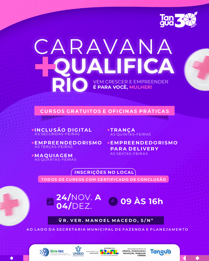 A Caravana + Qualifica Rio chegou a Tanguá oferecendo cursos e oficinas gratuitas para quem deseja desenvolver novas habilidades e ampliar suas oportunidades. Inclusão digital, empreendedorismo, maquiagem e tranças fazem parte da programação pensada para fortalecer a autonomia e o futuro dos nossos moradores.