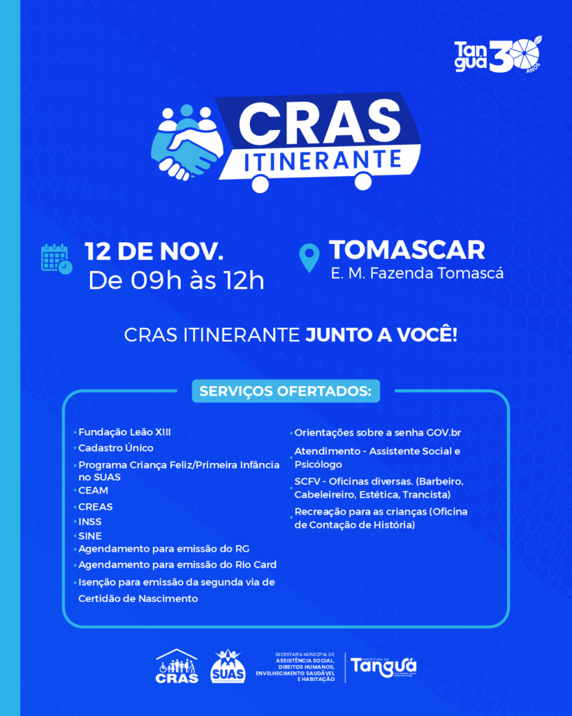 Nesta quarta-feira (12), estaremos em Tomascar oferecendo atendimentos e serviços sociais para facilitar o seu acesso a alguns direitos gratuitos.
