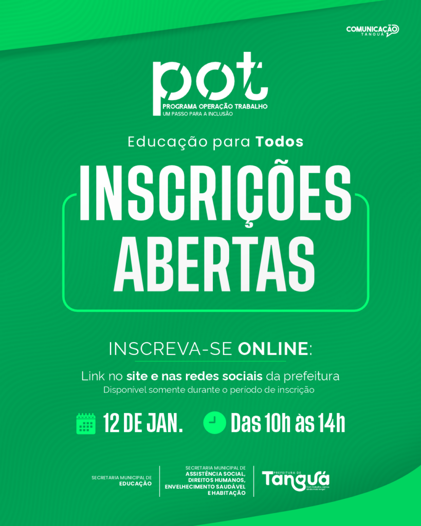A Prefeitura de Tanguá informa que estarão abertas, nesta segunda-feira (12), as inscrições para o POT Educação para Todos, programa que oferece 250 vagas, com capacitação profissional e auxílio mensal. As inscrições serão realizadas hoje, das 10h às 14h, exclusivamente de forma online. É fundamental que os interessados preencham o formulário com dados corretos e completos, tenham em mãos os documentos pessoais e todas as informações solicitadas e estejam atentos ao fato de que a seleção seguirá os critérios previstos em regulamento. O link de inscrição ficará disponível apenas durante o período informado, e dados incorretos ou incompletos poderão resultar em desclassificação. O acesso ao formulário estará disponível nos canais oficiais da Prefeitura.