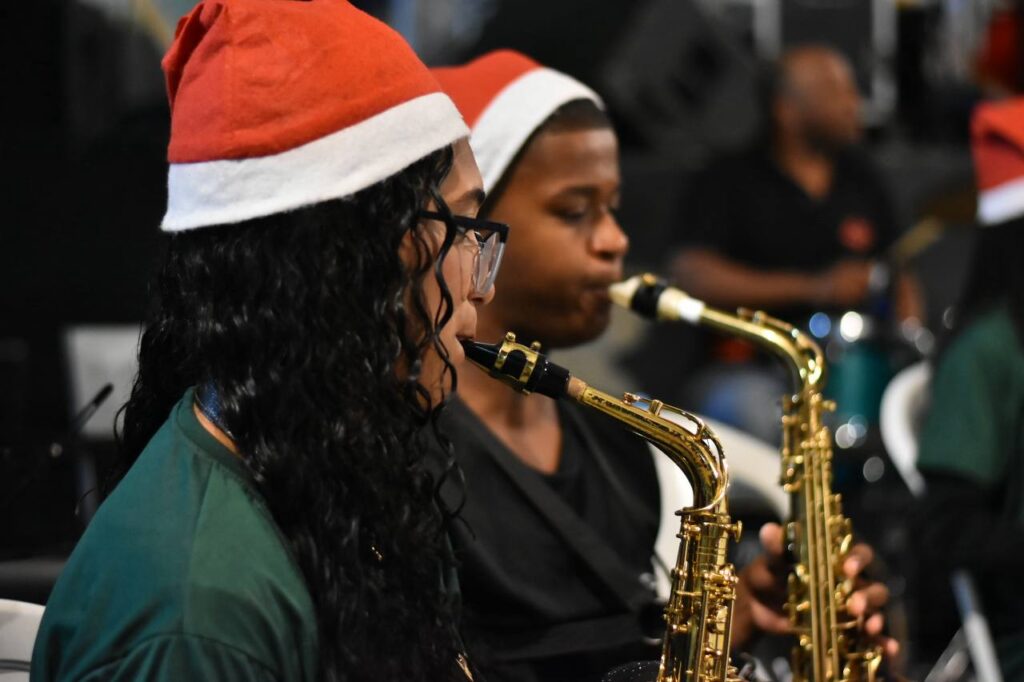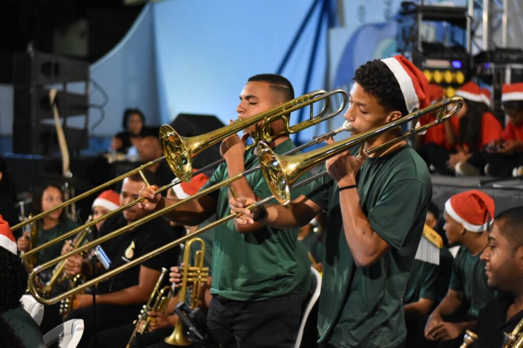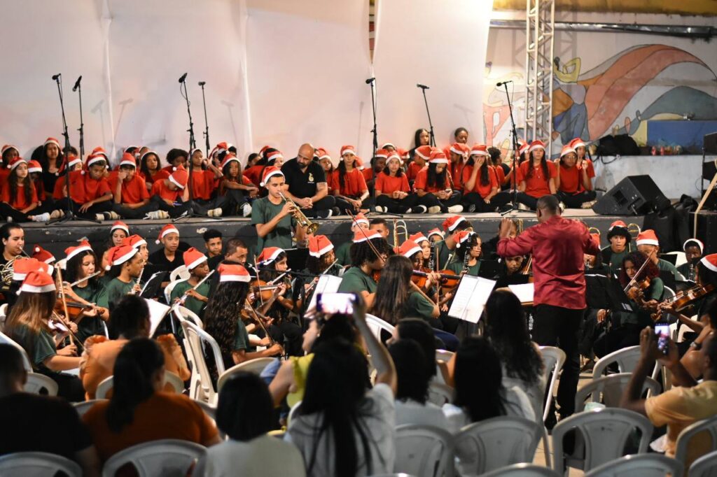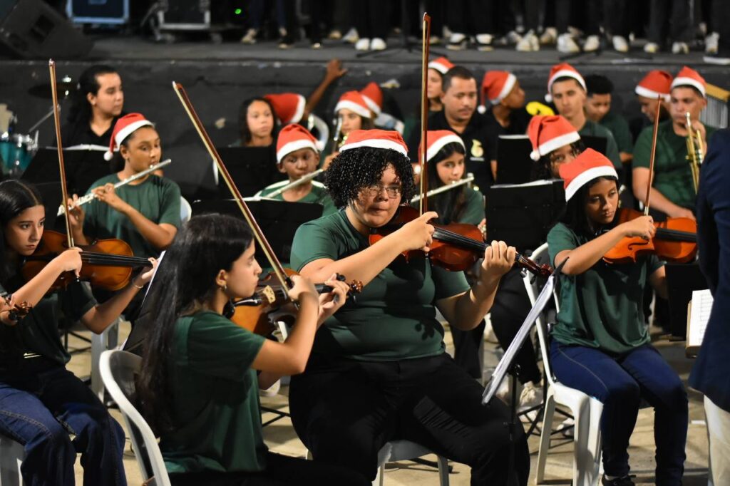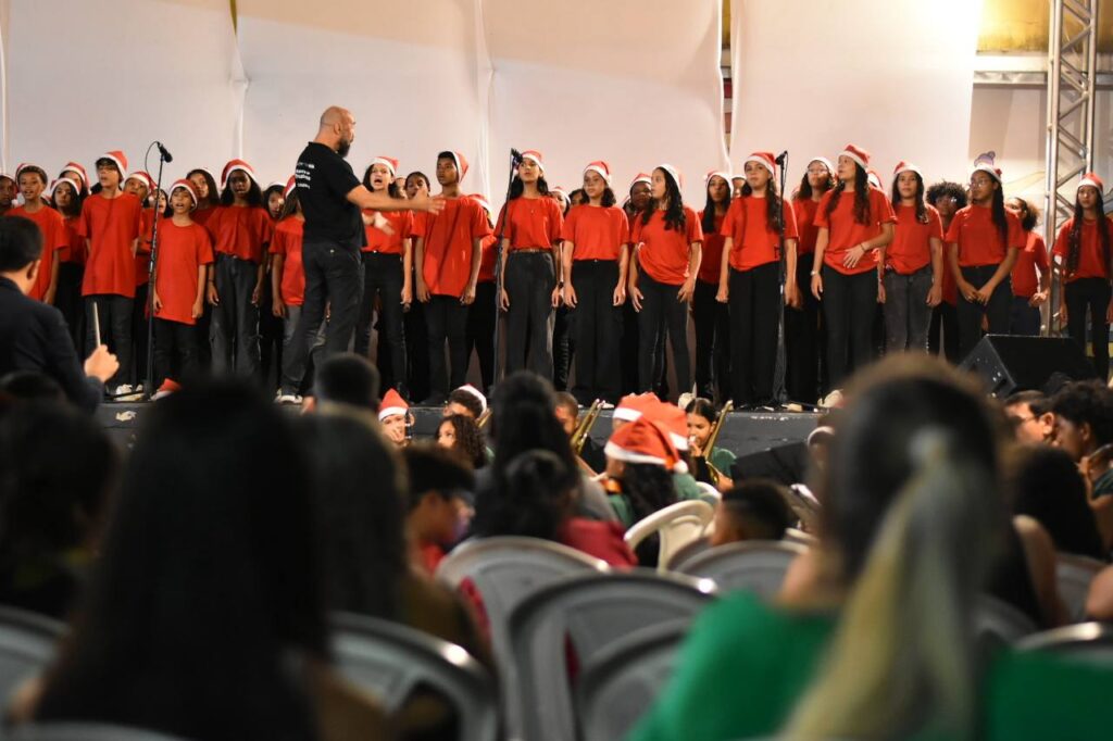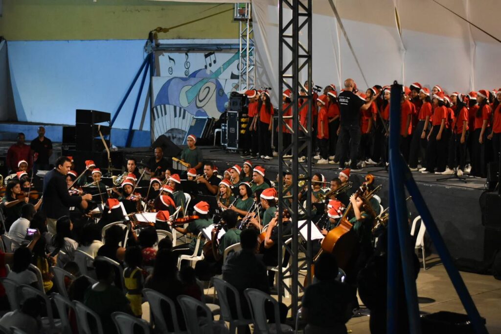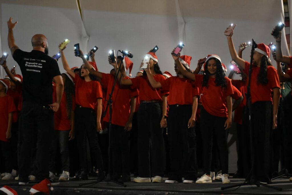 A primeira noite de programação reuniu famílias no Centro, apresentações da Orquestra que Transforma e do Coro Juvenil e distribuição de fotos impressas com o Papai Noel