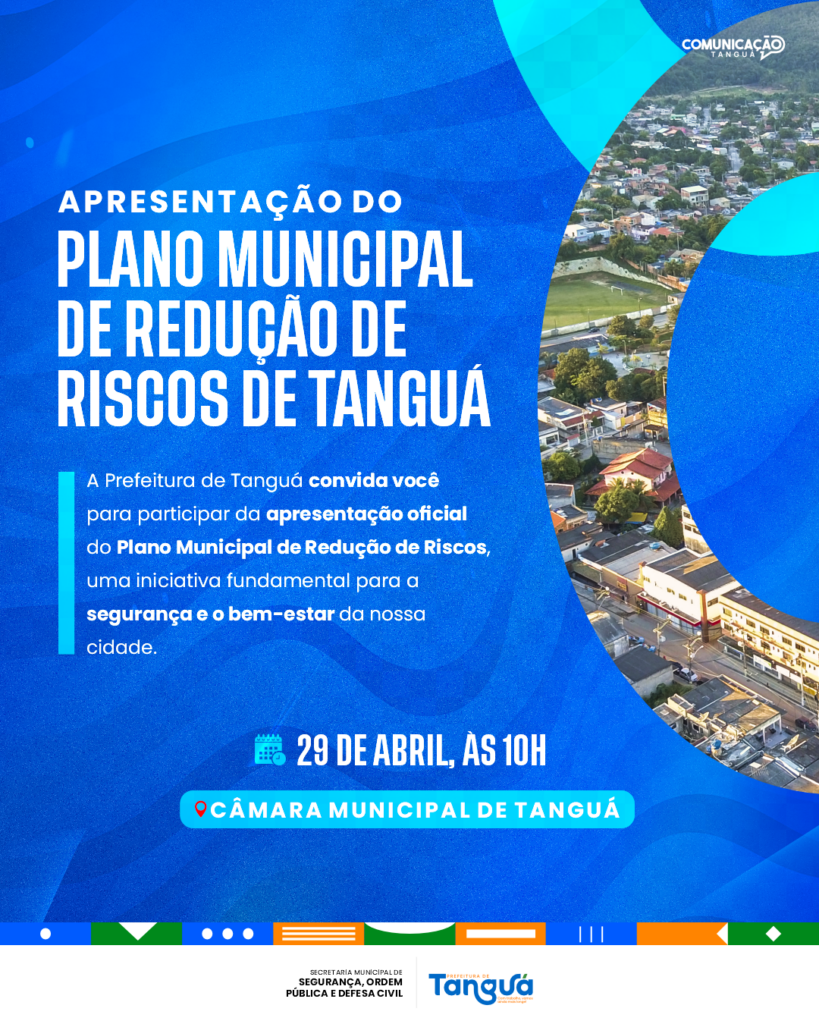 A Prefeitura de Tanguá, por meio da Secretaria Municipal de Segurança, Ordem Pública e Defesa Civil, realiza no próximo dia 29 de abril, às 10h, na Câmara Municipal, a apresentação oficial do Plano Municipal de Redução de Riscos.